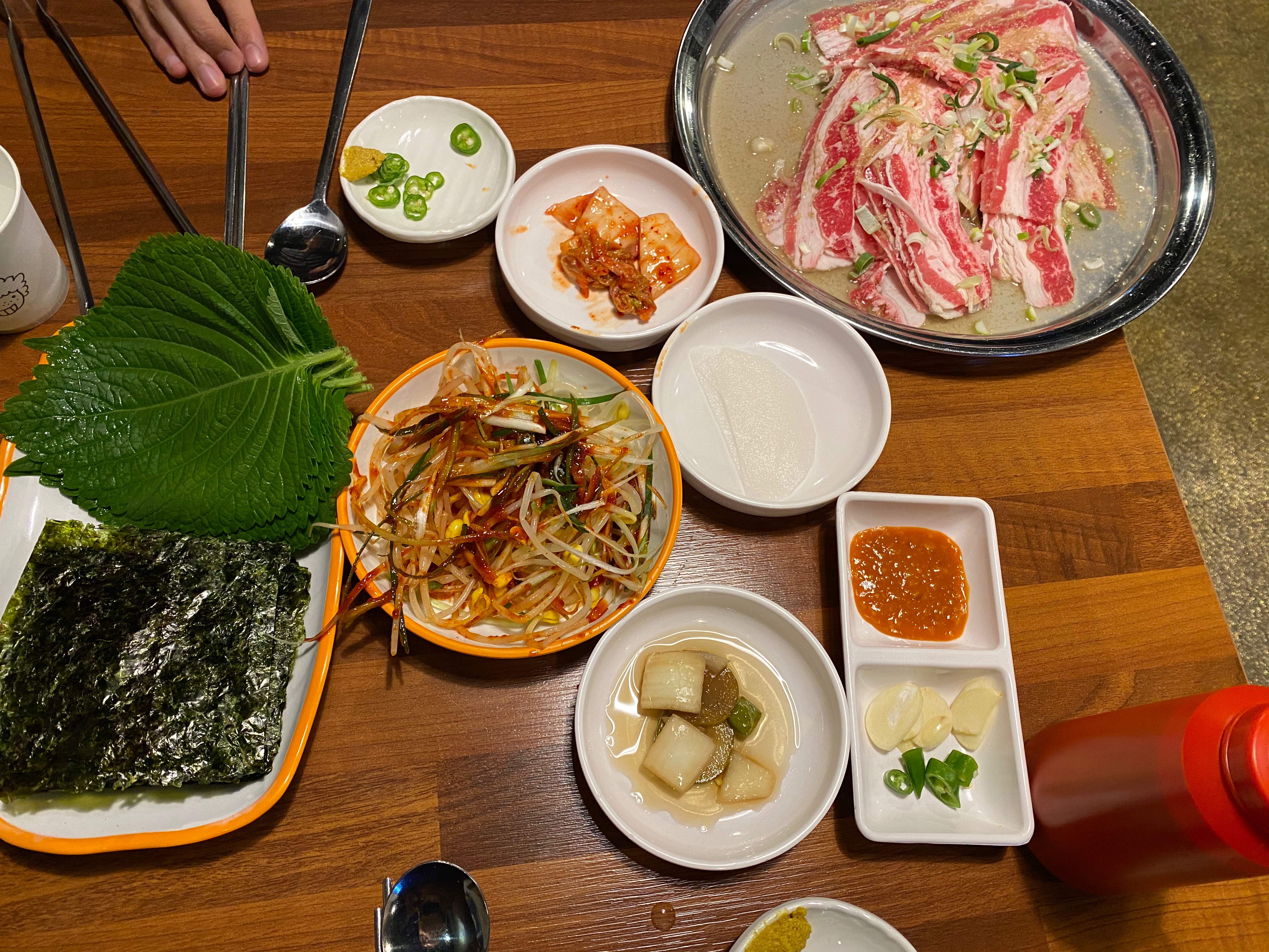우삼겹은 저렇게 간단한 양념이 되서 나오는데 얇고 냄새도 안난다. 반찬 중 구운김과 깻잎은 정말