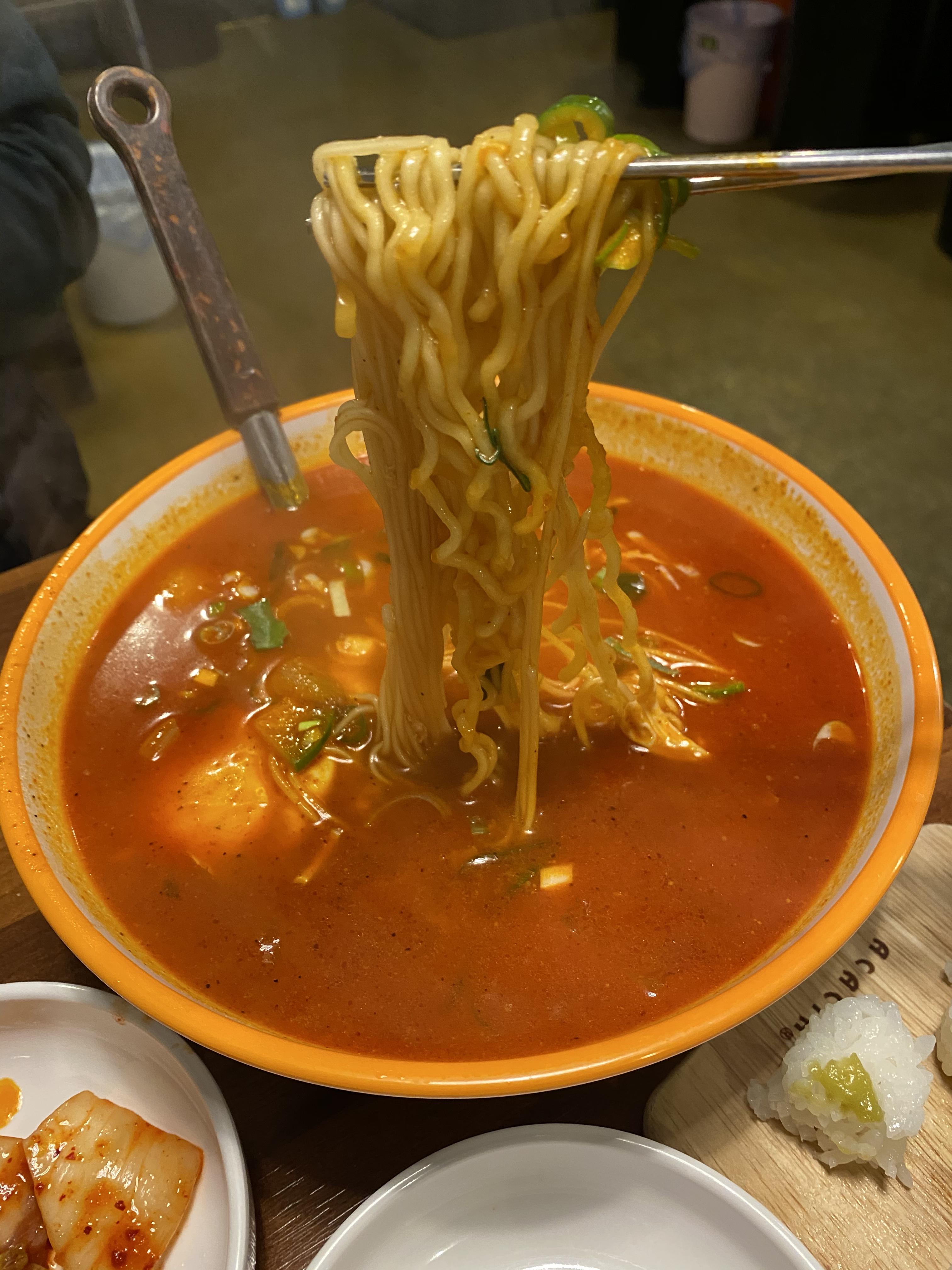 그리고 얼큰하고 칼칼한 라면국수다.이건 라면과 국수 면이 같이 들어가있는데 국물 맛은 순두부 찌개 맛과 비슷하고 살짝 덜익는 계란까지..필수 메뉴다!