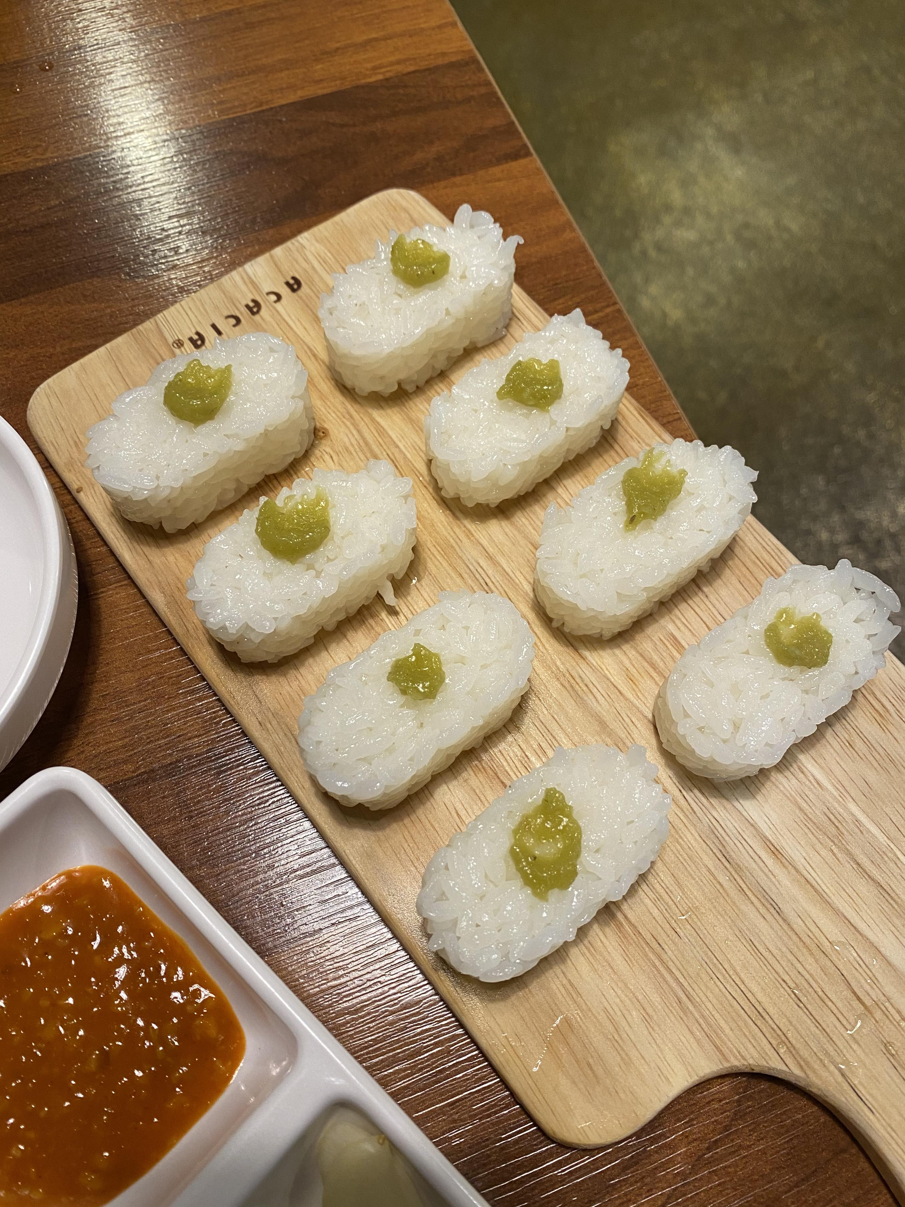 돌초밥은 이렇게 생겼는데 밥에 양념이 아주 적절하게 되어 나오는데, 이 위에 우삼겹 두개씩 올려 먹으면 그냥 끝...